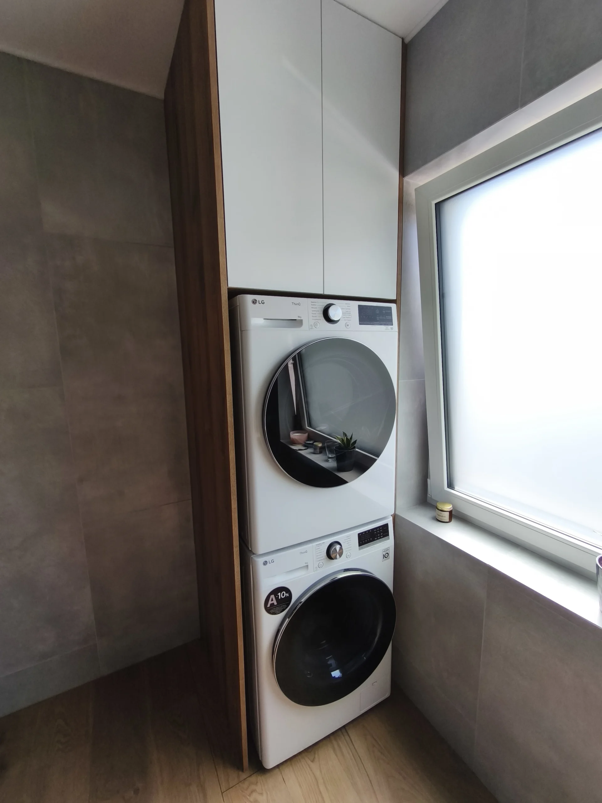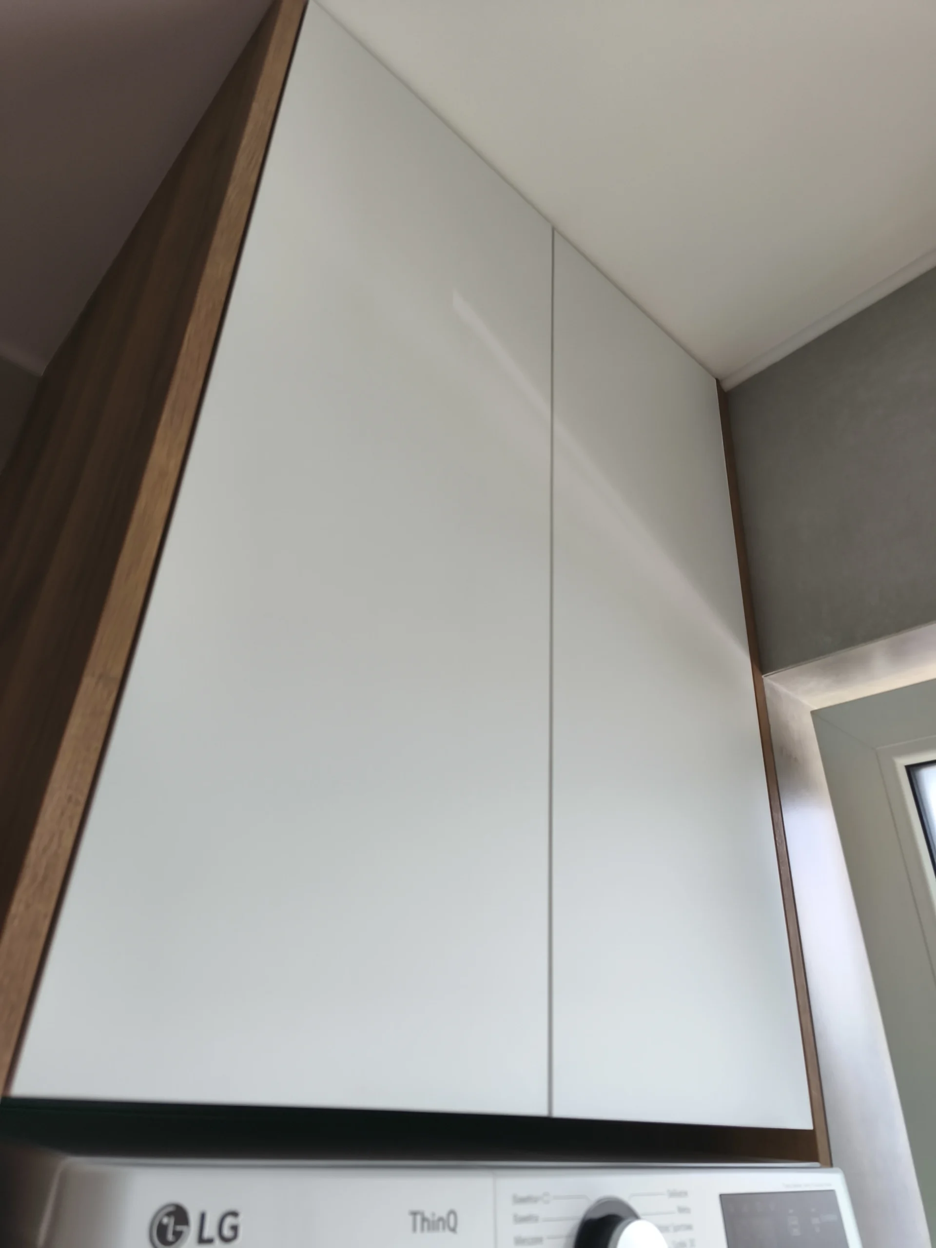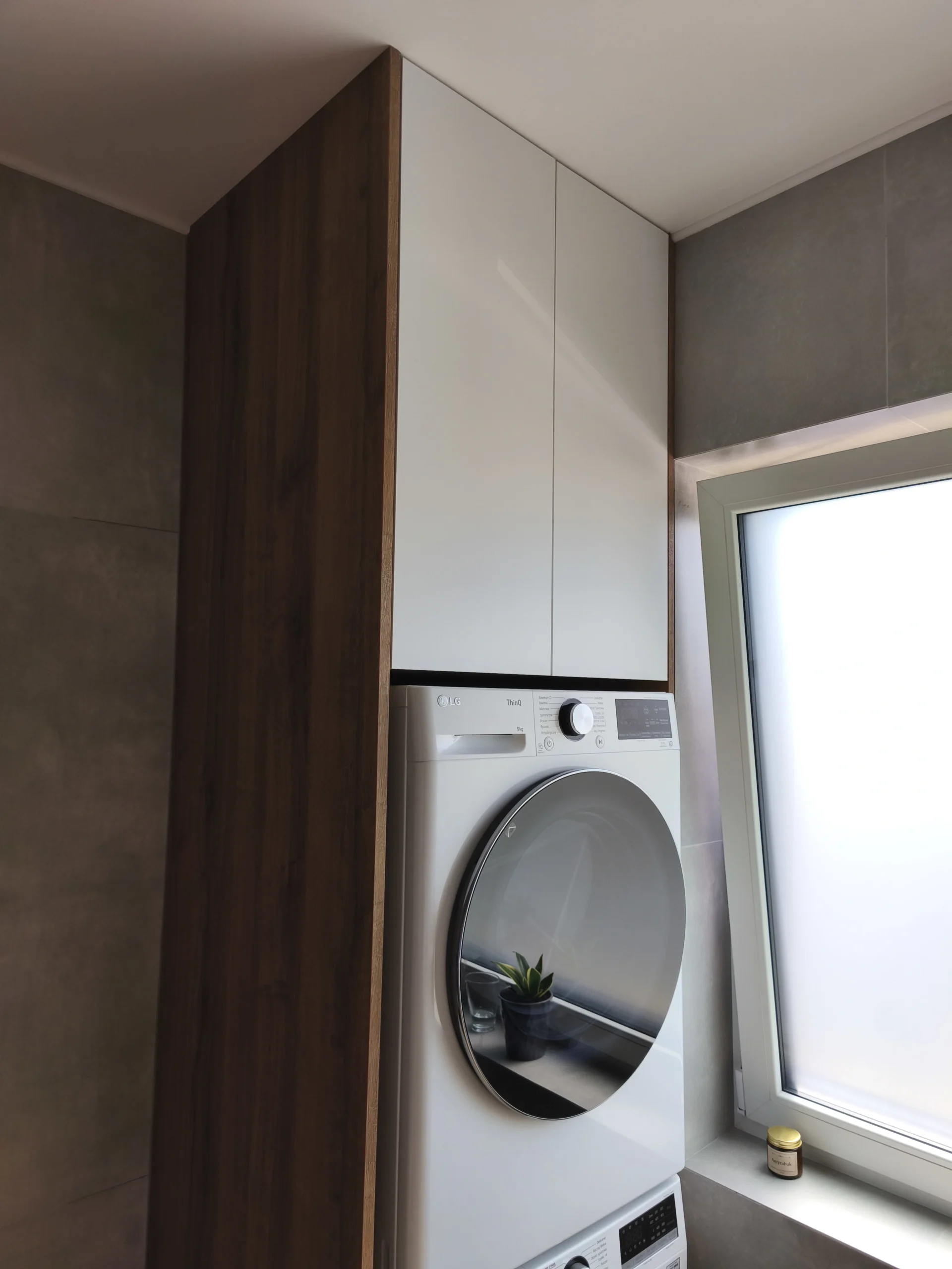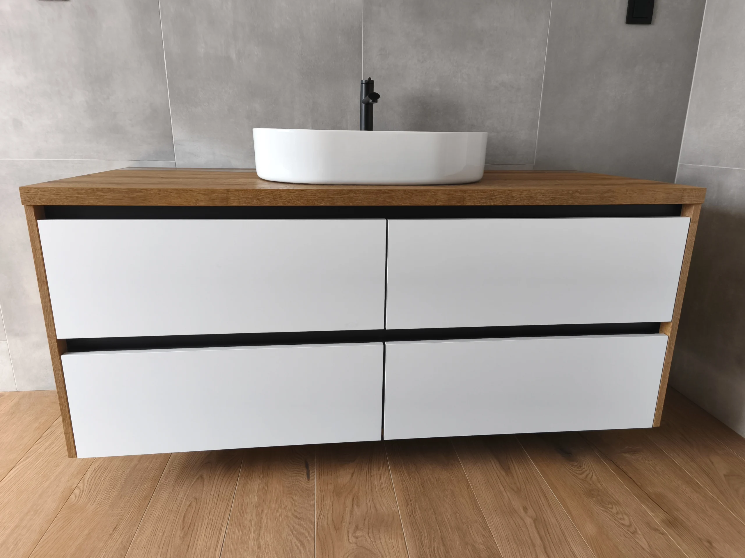 Fronty szafki wykonano z białego matowego akrylu, który pięknie odbija światło i nadaje wnętrzu eleganckiego, nowoczesnego charakteru. Blat oraz boki wykonane zostały z wysokiej jakości płyty meblowej EGGER H1344 ST32 Dąb Sherman koniakowy brązowy 18 mm – to doskonałe połączenie stylu i trwałości. Ten sam dekor został wykorzystany także do stworzenia zabudowy pralki i suszarki, co pozwoliło zachować spójność estetyczną i funkcjonalność w całej przestrzeni.