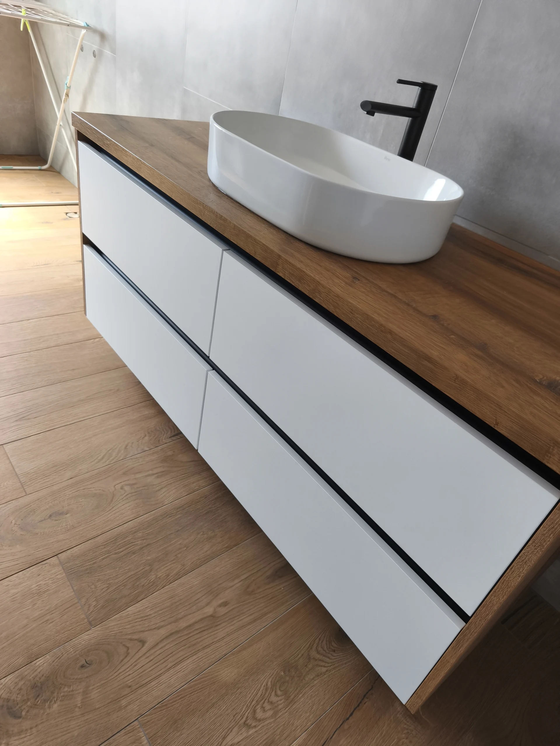 Prezentujemy kolejną realizację naszej pracowni stolarskiej Emmi Kuchnie – funkcjonalną i estetyczną zabudowę łazienkową wykonaną w całości na wymiar. Projekt obejmował wykonanie szafki łazienkowej z czterema szufladami opartymi na solidnym systemie Blum Merivobox, który gwarantuje niezawodność i komfort użytkowania przez wiele lat.